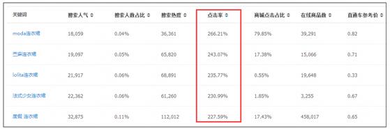 点击率是一个非常重要的指标。在用生意参谋选词的时候,可以看到每一个关键词“点击率”这个数据指标。这个指标尤其是在新品期是非常重要的,因为关键词是给你展现的机会,但是抓住机会的能力(点击率)才能真正的体现你的产品吸引力。