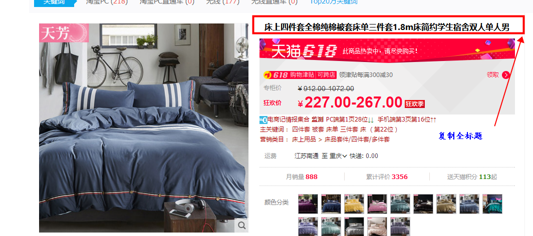 同样我们搜索四件套(大词)出现在前面的宝贝都是月销量上万,几千的宝贝,那么如果我们的宝贝标题用的都是大词,而且我们的宝贝基础权重很低,可想而知会排到多少页。所以在新品前期宁愿放弃搜索热度很高的词也要找到一些适合宝贝当下能够快速获得展现的蓝海词,才可以快速的突破。